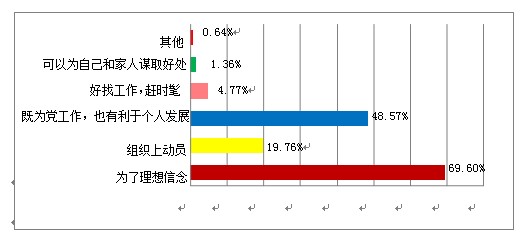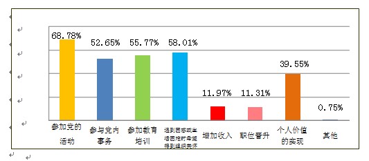 3、大多数党员价值取向正确、利益诉求务实,少数党员入党动机不纯、功利化倾向严重、价值观扭曲。调研发现,多数党员能够坚持正确的价值观,思想日趋活跃,个人利益诉求更趋多元。调查显示,在入党动机上,为了理想信念的占69.6%;基于既为党工作,也有利于个人发展而入党的占48.57%;组织上动员的占19.76%;为了好找工作,赶时髦的占4.77%;可以为家人和自己谋取好处的占1.36%(见图5)。在看待党员利益上,选择参加党的活动的占68.78%;选择在遇到困惑或生活困难时,希望得到组织关怀的占58.01%;选择参加教育培训的占55.77%;选择参与党内事务的占52.65%;选择个人价值实现的占39.55%;选择增加收入的占11.97%;选择职位晋升的占11.31%;选择其他的占0.75%,平均每位党员选择了2.6项利益诉求(见图6)。在处理个人利益与集体利益、他人利益问题上,选择为了集体利益愿意牺牲个人利益的占46.5%;选择在不损害个人利益的情况下,愿意帮助别人的占26.23%;选择党员也有个人的正当利益,实现自身价值应得到尊重的占25.33%(见图7)。这同时也客观反映了一些党员在市场经济大潮中迷失方向,不能正确认识价值问题;一些党员入党动机不纯,把入党作为谋取个人利益的途径。调研中大家反映,有的党员把个人利益放在首位,好事拼命抢,困难使劲推,与民争利,搞权钱交易。