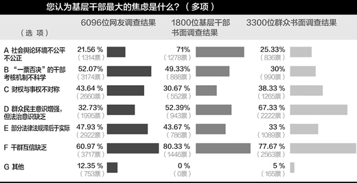 样本分布:(1)参与网友6096人;(2)发放书面问卷5500份,回收有效问卷5100份,其中参与的基层干部1800人、普通群众3300人。